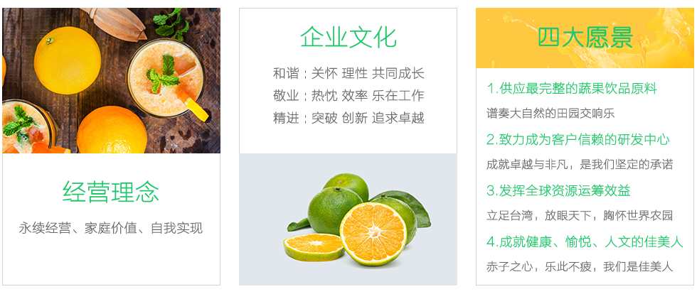 在公司發(fā)展壯大的13年里,我們始終為客戶提供好的產(chǎn)品和技術(shù)支持、健全的售后服務(wù),不斷引進國外的先進技術(shù)和科學(xué)管理模式,逐步健全了與產(chǎn)品發(fā)展相適應(yīng)的具有農(nóng)產(chǎn)品加工特點的質(zhì)量管理體系,全體職員本著“和諧、敬業(yè)、精進”的理念,竭誠為國內(nèi)外的顧客提供最優(yōu)質(zhì)的服務(wù)。我公司采用國內(nèi)、外先進生產(chǎn)設(shè)備,年生產(chǎn)能力20000噸以上,主要產(chǎn)品包括:橙濃縮汁、蜜橘濃縮汁、柑橘原汁、檸檬原汁、血橙濃縮汁、芒果漿、橙果粒罐頭、橙瓣罐頭、白柚果粒罐頭、仙草凍罐頭、檸檬切片罐頭、速凍橙蓉、速凍檸檬蓉、速凍橙皮(丁、絲)、速凍檸檬皮(丁、絲)、蜜漬橙皮檸檬片、柚子等。南充佳美產(chǎn)品行銷覆蓋全國及遠銷海內(nèi)外,是國內(nèi)濃縮汁、原汁、及速凍產(chǎn)品行業(yè)規(guī)格最大、最具競爭力的企業(yè)之一,期待與您的合作。
